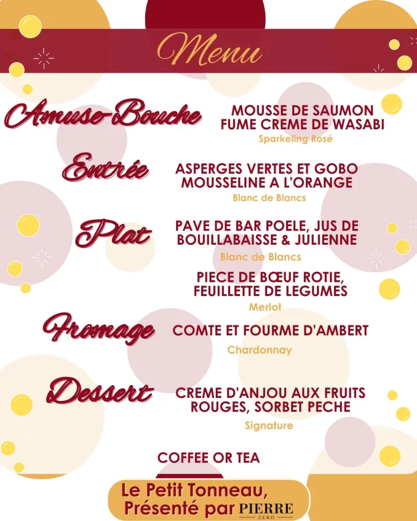 Profitez d’un menu exclusif concocté spécialement par le chef Philippe BATTON du restaurant Le Petit Tonneau, en collaboration avec « Pierre Zéro » ! Un mocktail spécial à base de vin Pierre Zéro, servi uniquement pour une journée, sera proposé par un barman professionnel. Seulement 90 places disponibles !